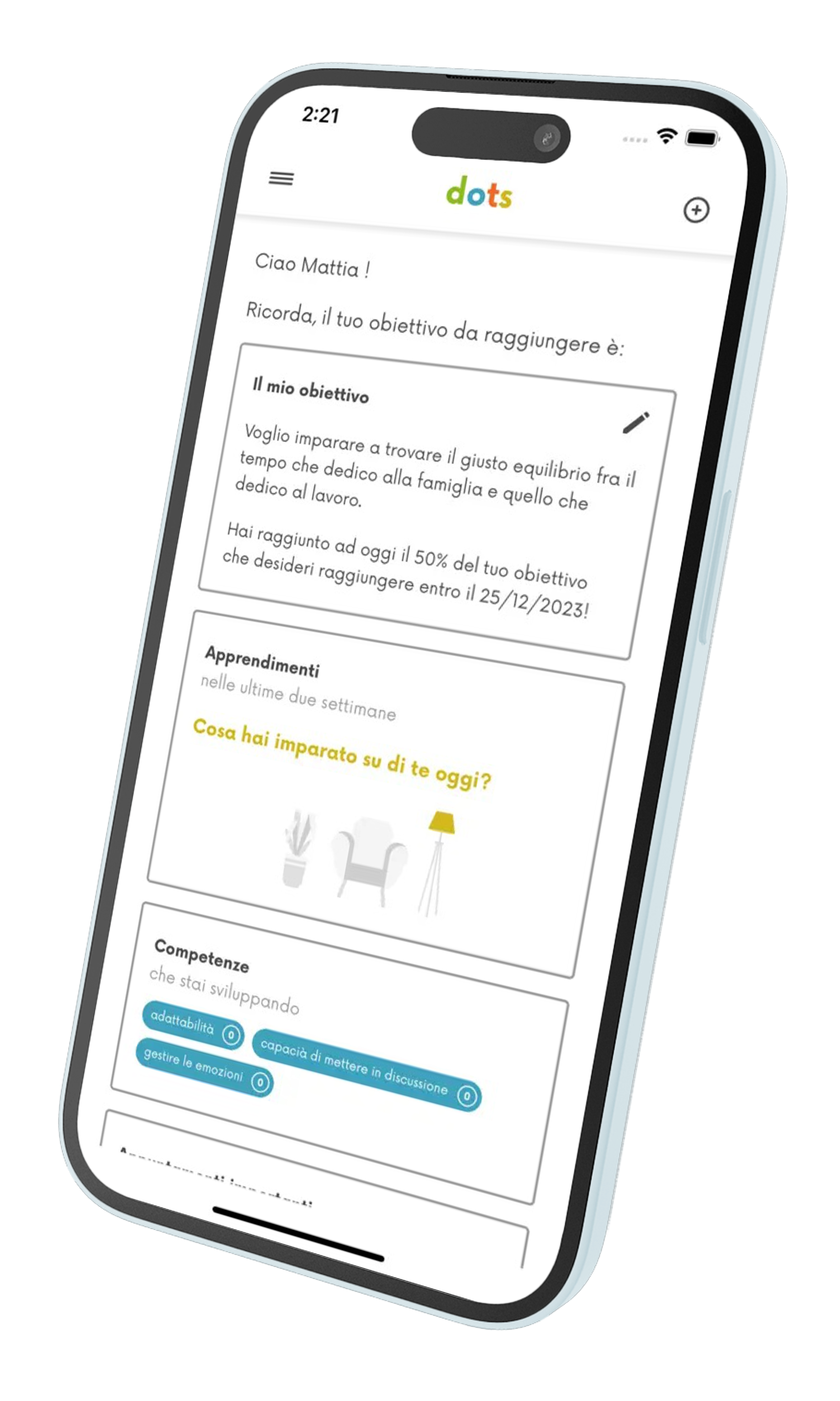 Sempre con te, su Android, iPhone e web, DOTS trasforma l'apprendimento in un processo dinamico e costantemente attivo, potenziando il processo di coaching e la sua influenza sul tuo sviluppo personale e professionale.